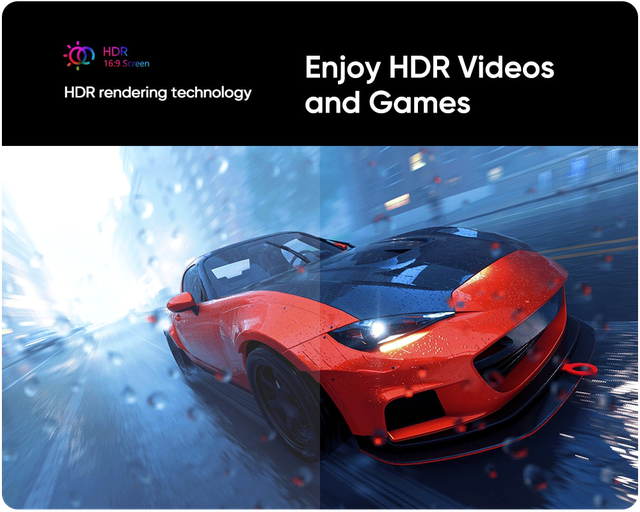 HDR піднімає якість зображення на новий рівень, створюючи динамічніше візуальне занурення з покращеними кольорами. Цифровий стандарт HDR базується на кольоровій гамі sRGB 99% (тип.). Це справжня різниця у кольорі та яскравості.