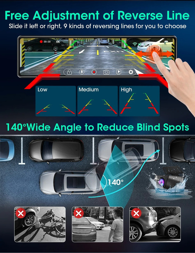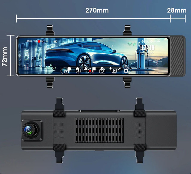 11.26 дюймів повний екран, широке поле зору, менше сліпих зон, зручне і безпечне водіння. Після того як ви запустите двигун автомобіля, на екрані включиться зображення з камери заднього виду. Для використання його як стандартне дзеркало ви можете провести пальцем по екрану праворуч на ліво або натисканням кнопки знизу. Коли вимикається екран, відеозапис буде продовжуватися. Ми рекомендуємо пересуватися при включеному зображенні заднього виду, так як ви виключите можливість не побачити автомобіль ззаду, при перестроюванні з смуги руху або в інших випадках.