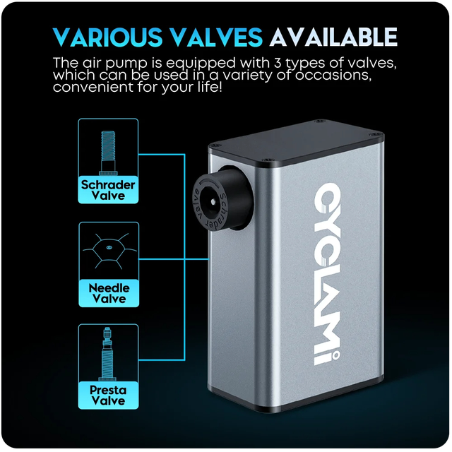 Універсальні клапани. Завдяки цьому пристрій підходить для велосипедів, м'ячів, матраців та інших надувних виробів CYCLAMI A3 Max сумісний із трьома типами клапанів: