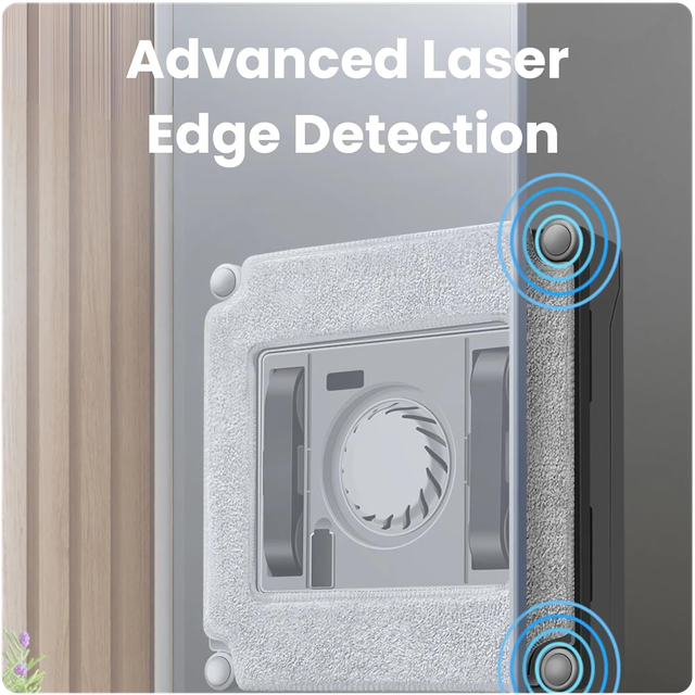 Лазерні сенсори точно визначають межі вікна, навіть якщо в нього немає рамки. Робот не впаде — він вчасно змінює напрямок.