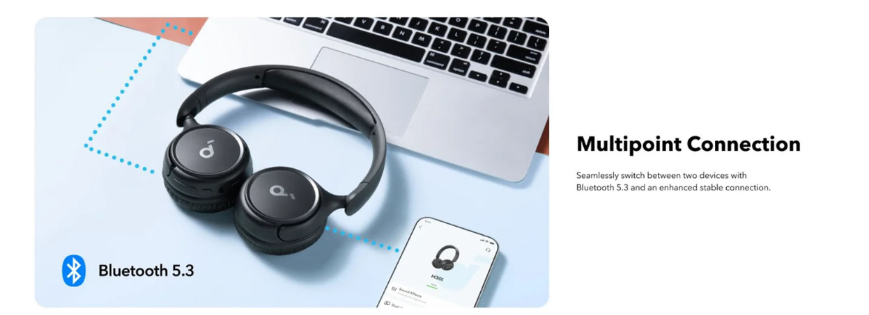 Навушники Anker SoundCore H30i забезпечують надійне та безперебійне з'єднання завдяки сучасній технології Bluetooth 5.3. Це дозволяє легко перемикатися між пристроями, незалежно від того, чи ви слухаєте музику, дивитеся фільм, чи приймаєте вхідний дзвінок. Підключення через Bluetooth 5.3: забезпечує стабільне та швидке з'єднання з мінімальною затримкою, що ідеально підходить як для музики, так і для перегляду відео чи онлайн-дзвінків. Підключення через кабель mini-jack (3.5 мм): для тих моментів, коли потрібно використовувати дротовий варіант, наприклад, під час роботи з ПК або іншими пристроями без Bluetooth.