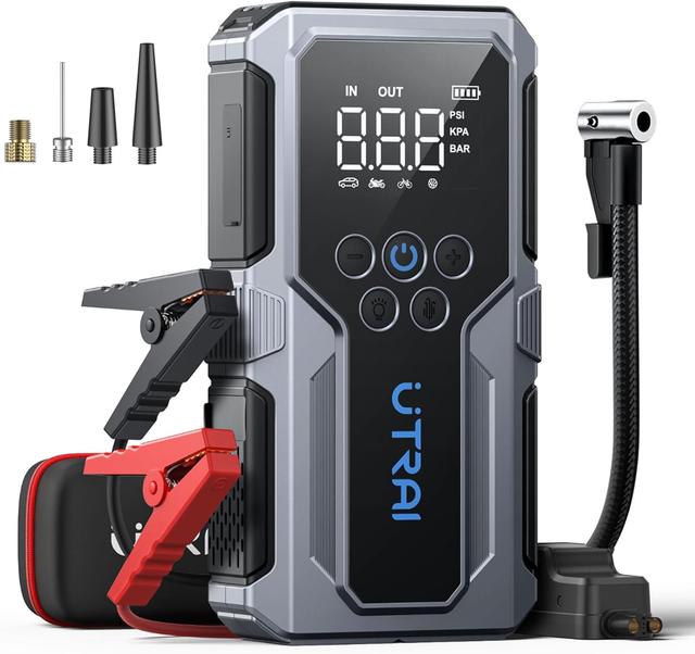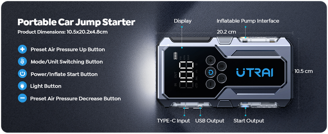 Пусковий автомобільний пристрій Jump Starter UTRAI Jstar 9 1500А / 15000mAh з вбудованим компресором для підкачування шин 150 PSI. Jump Starter UTRAI Jstar 9 — це багатофункціональний пристрій, який об'єднує в собі пусковий блок для автомобіля, компресор для шин, заряджання для ґаджетів і ліхтарик. Вона розроблена для запуску автомобільних двигунів, підкачування шин і заряджання електроніки в будь-яких умовах, що робить його незамінним для автолюбителів.