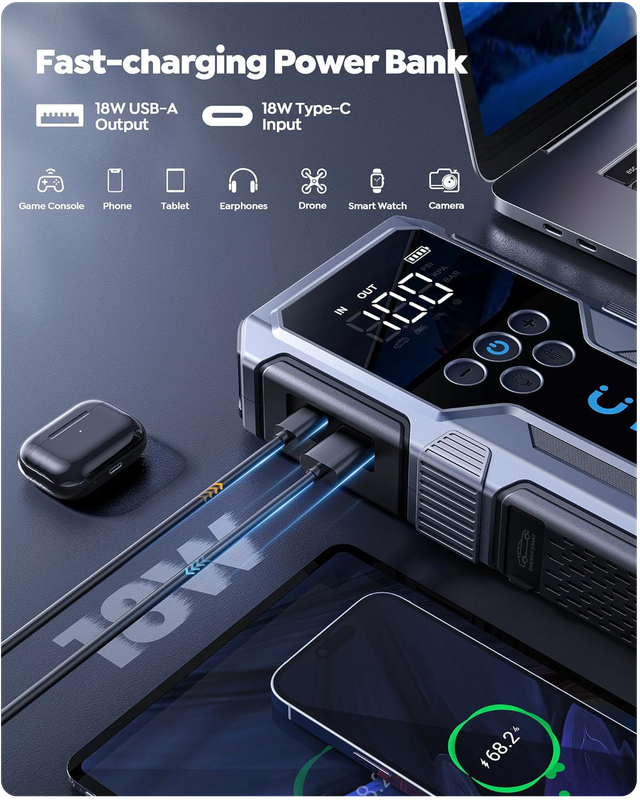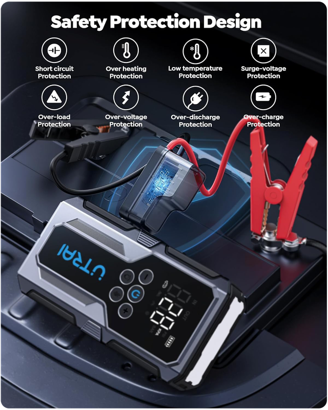 UTRAI Jstar 9 — справжній помічник у темряві або при відключенні електроенергії. Використовуйте як ліхтар, сигнал тривоги або SOS-маяк. Це пусковий автомобільний пристрій, який заведе ваш автомобіль, підкачає шини, зарядить телефон і освітить дорогу — усе в одному компактному корпусі.