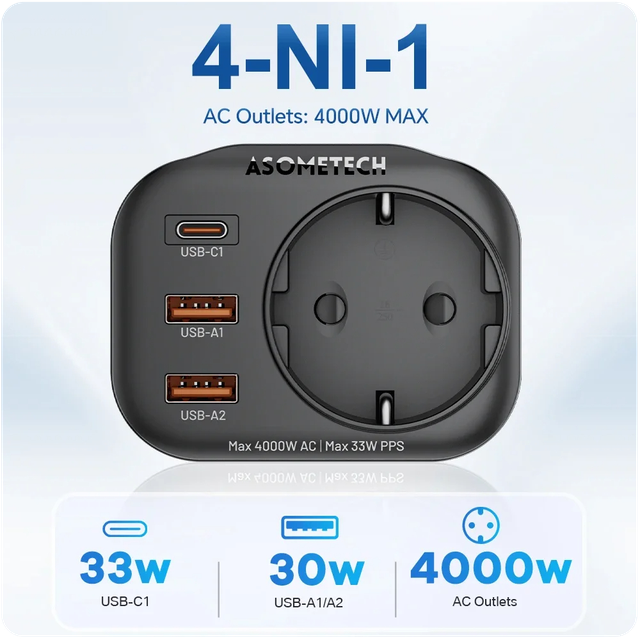 Четыре устройства одновременно — без перегрузки, без снижения скорости, без риска. Просто подключайте и работайте, заряжайте или отдыхайте. Сетевой фильтр тройник ASOMETECH WP09‑PD 4 в 1 + 2 USB | 1 Type‑C | 33W — это мощный, безопасный и компактный помощник для тех, кто ценит порядок, скорость и технологии. Идеален для дома, офиса, путешествий — везде, где нужно много зарядки в одном устройстве. Надёжно. Современно. С умом.
